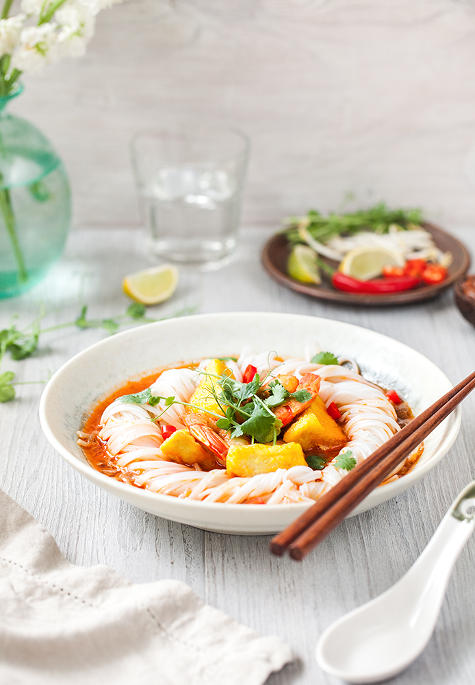 Indulge your cold-weather cravings this season with a hot bowl of homemade soup. This spicy soup is a fusion of Ethiopian and Malaysian flavors. Asia and Africa meet in a big bowl. Fragrant spicy broth, firm rice noodles, delicious crispy tofu and sweet prawn. This is a flavour explosion in a bowl, created especially for you, my dear noodle soup lovers. Enjoy the slurp, the chili, and prepare your chopsticks.
