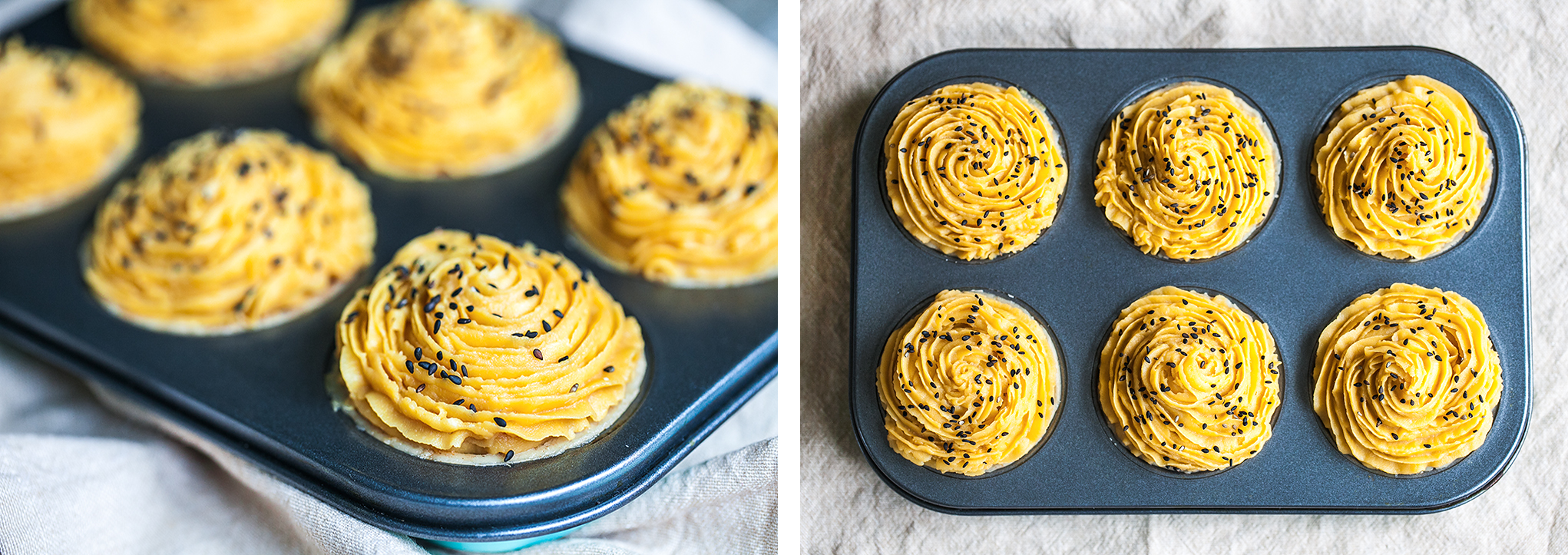 - Fill each pastry-lined cup with the curry filling, almost up to the top then top with kumara mash using the piping bag. Sprinkle with toasted black sesame seeds. Bake until kumara is nice and crispy on edges, 20 to 30 minutes. Serve hot with chilled Mamia’s Kiwi Hot sauce and a green salad.