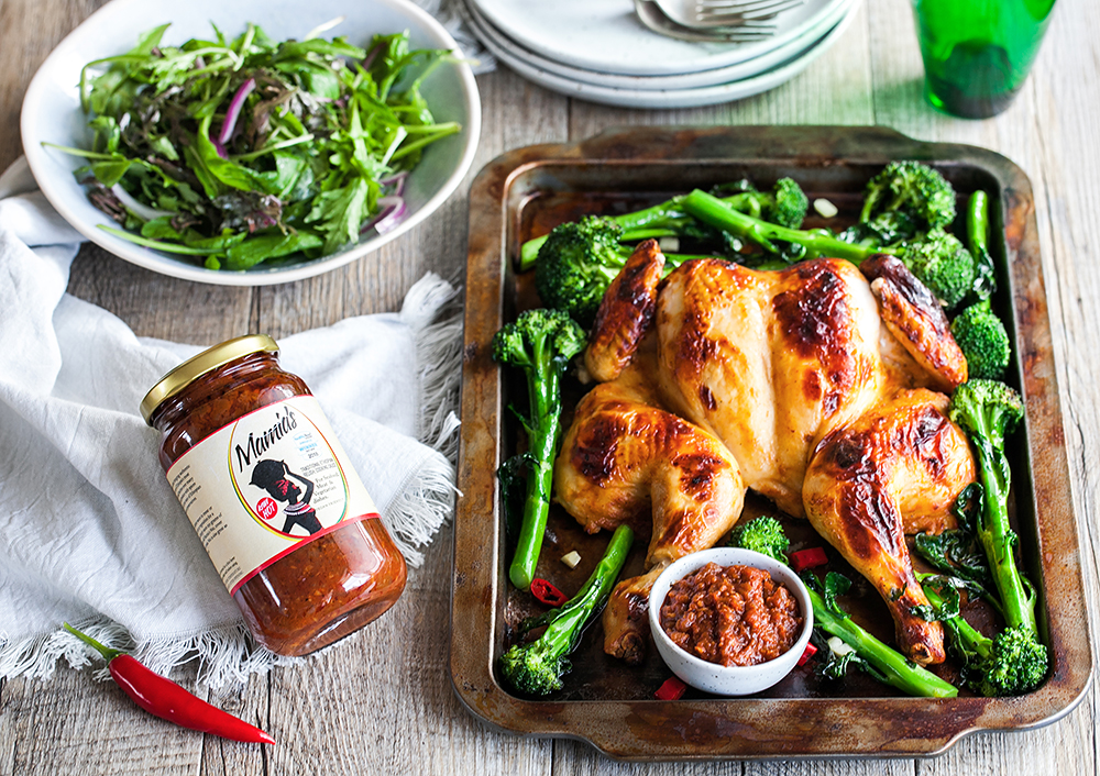 - Remove the chicken from the marinade, and shake off excess. Discard the remaining marinade, and place the chicken onto the baking sheet. Tuck wings back behind the breasts. Cook until the chicken is brown and juices run clear when you cut between the leg and the tight. About 40-50 min (depends on chicken weight and your oven). Let rest 10 minutes before serving. Serve warm with garlic broccolini and Mamia’s sauce.